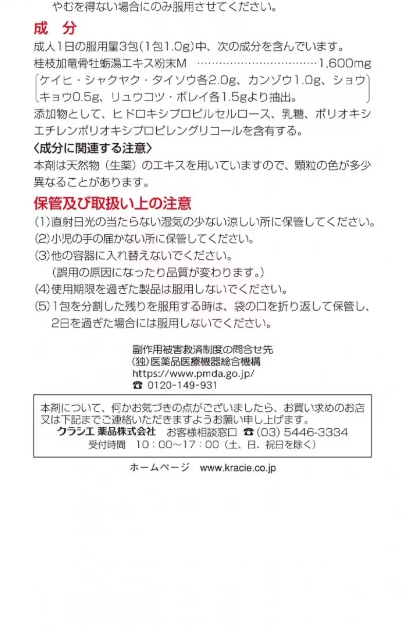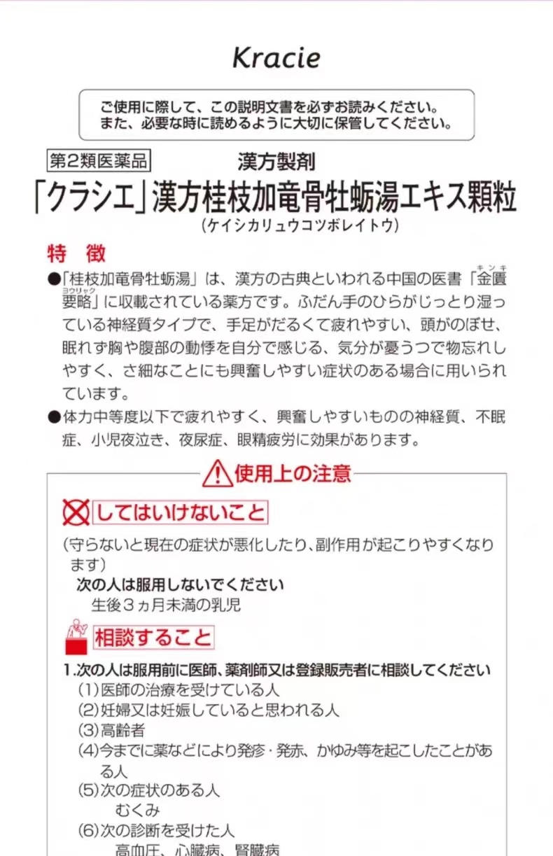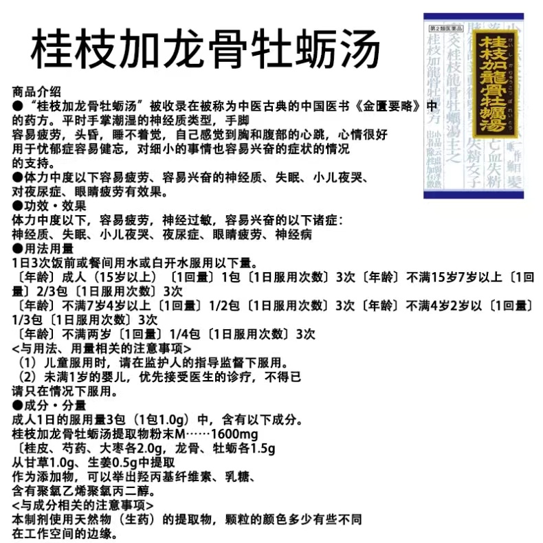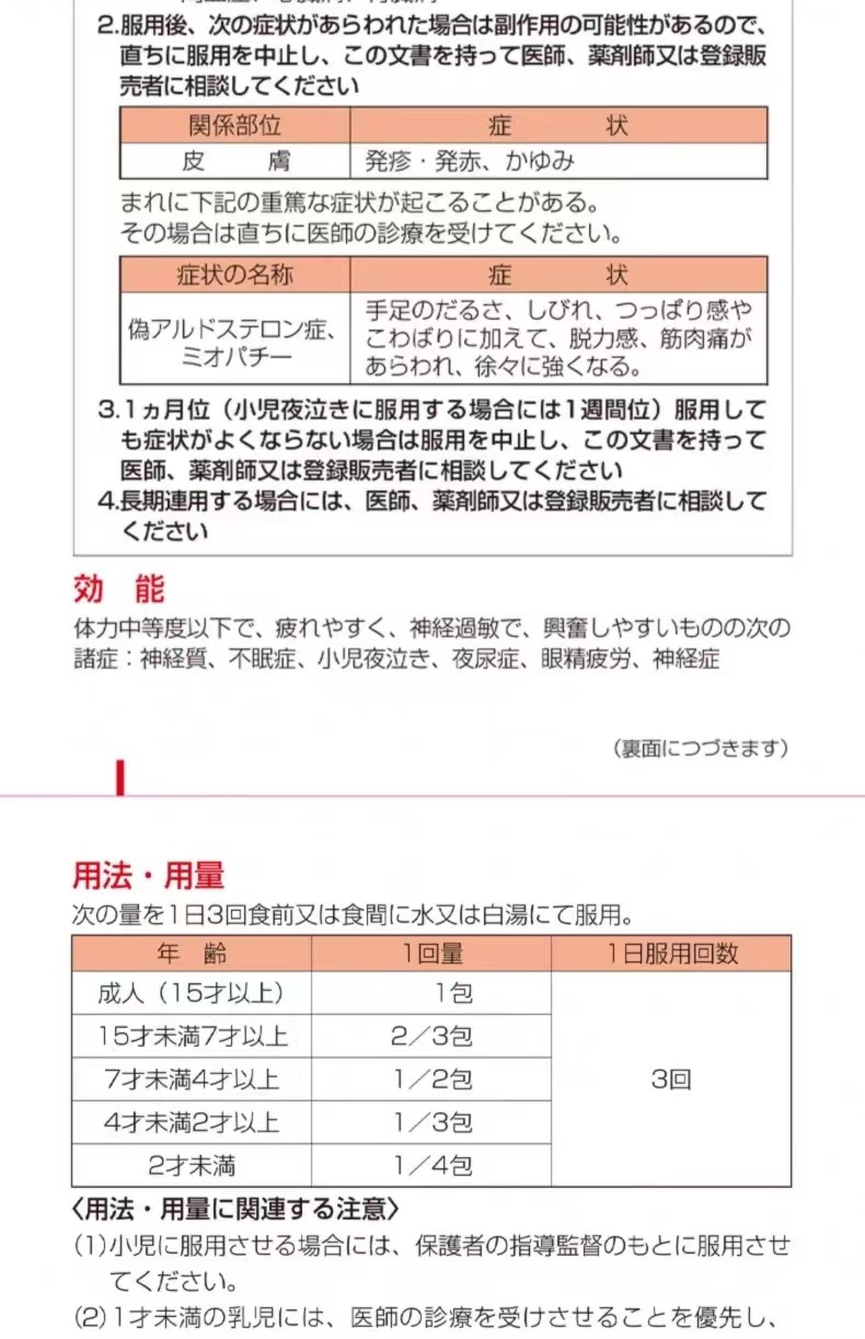 服用方法:成人每日3次,15岁以上每次1袋7-15岁,1次2/3袋; 4-7岁,1次1/2袋;2-4岁,1次1/3袋;   2岁以下不要服用适应/主治:容易疲劳,神经质失眠症、小儿夜啼、夜尿症、眼睛疲劳等注意事项:感冒发热勿服。若出现敏感或不适症状。请立即停止服用及咨询您的医生
